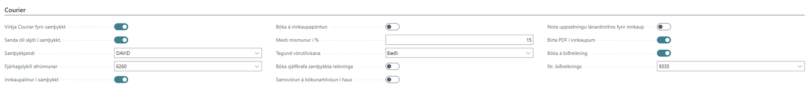 Þegar reikningur eða pöntun hafa verið samþykkt þá bókar kerfið skjalið sjálfkrafa nema mismunur milli rafræns reiknings og innkaupaskjals sér meiri en valið er í "Mesti mismunur í %" reitnum.